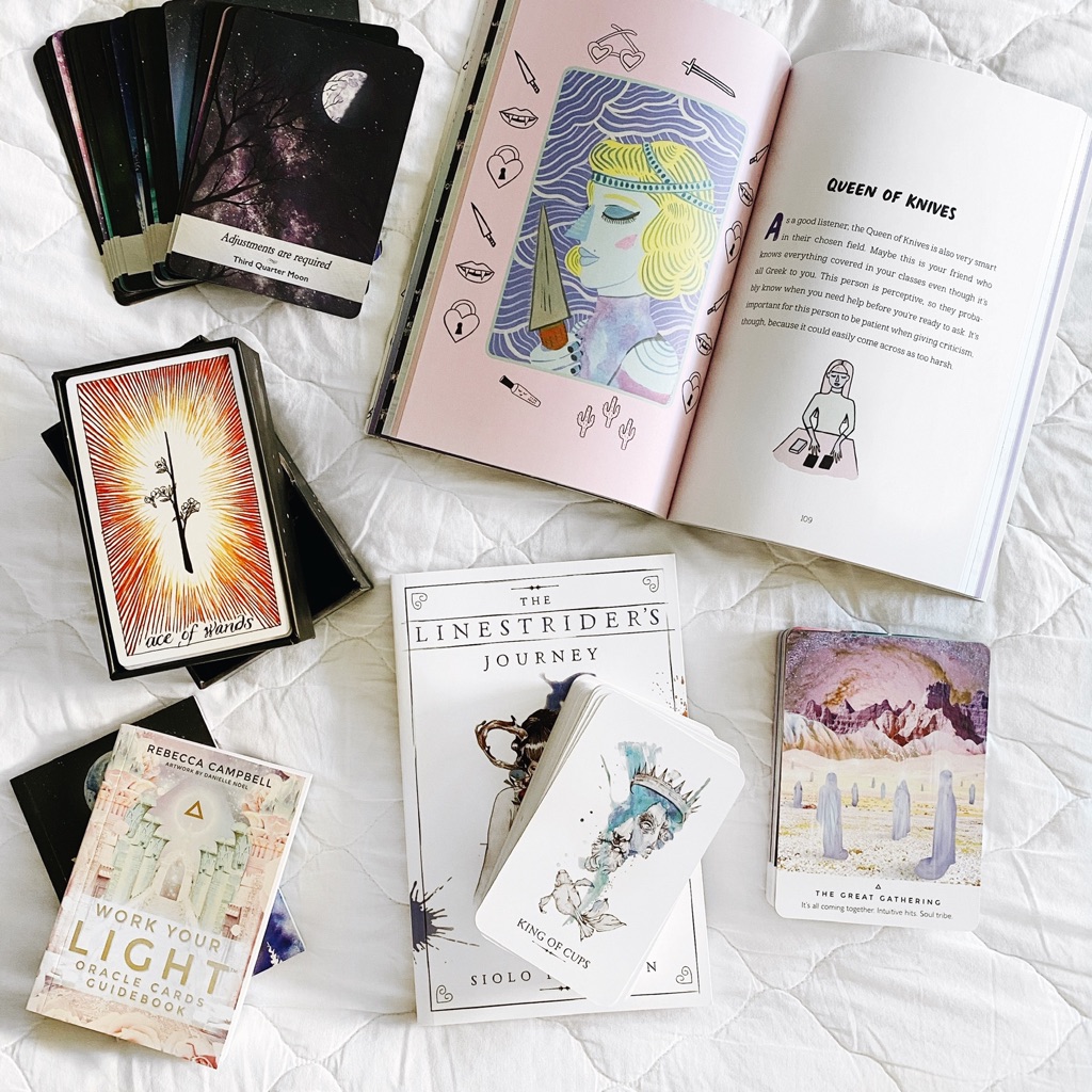 Comprei alguns decks de tarot e oráculos lindos, e estou aprendendo, aos poucos, sem pressa, a fazer novos jogos e a entender os significados de cada carta.
